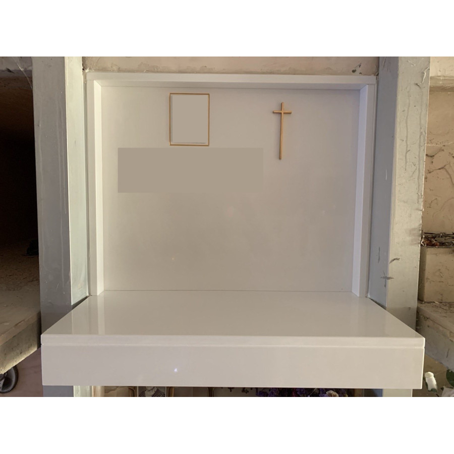 - Lapide in marmo bianco con fotoceramica a colori 9×12 ovale o rettangolare, epigrafe incisa o bronzo romano o corsivo, croce stilizzata.