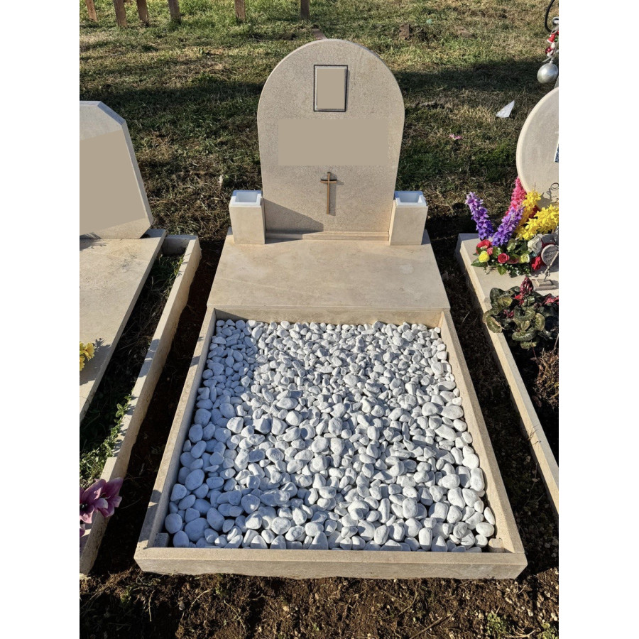- Monumentino in marmo di travertino prima scelta, con mezzo piano, alzata rettangolare con croce incisa 3d, fotoceramica 9 x 12 a colori ovale o rettangolare,